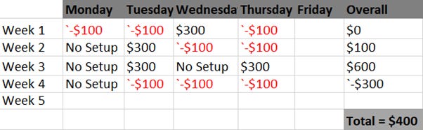Looking ahead to the next week, imagine scoring wins on two days ($300 + $300 = $600 ) and taking losses on two days (-$100 + -$100 = -$200 ) . By the end of the week, you're looking at a tidy profit of $400.